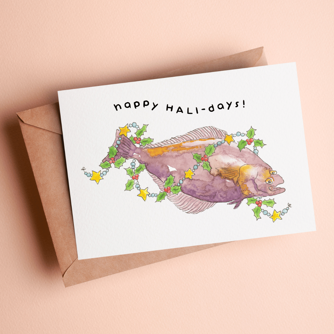 "Happy Halidays" Halibut Fish Funny Punny Christmas Greeting Card